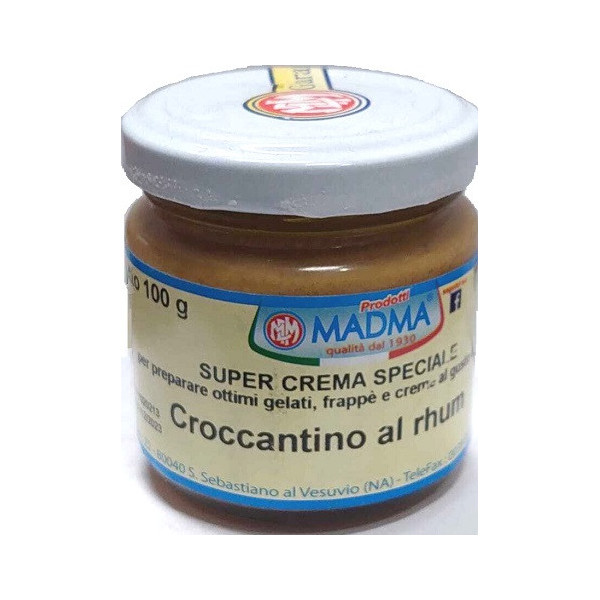 Pasta Croccantino al Rum (o Rhum) Madma in barattolo da 100 g. Preparato concentrato, a base di arachidi, ideale per aromatizzare gelati, creme, impasti da forno, dolci, biscotti e torroni. Perfetto per pasticceria e gelateria artigianale. Scelta ideale per gli appassionati di pasticceria.