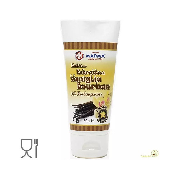Pasta con estratto di vaniglia Bourbon del Madagascar in tubetto da 50 g, con semi di vaniglia da Madma. Usala per preparare dolci da forno e creme cotte o panna montata e creme al burro.