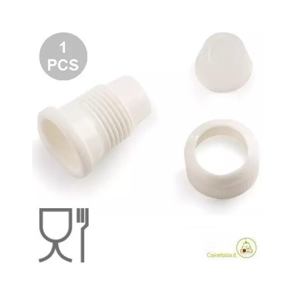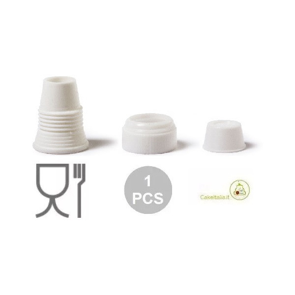 Set si 1 o 12 adattatori per cornetti standard, pratici per cambi veloci dei cornetti alla sac à poche senza svuotarla, grazie al cappuccio di chiusura salva freschezza, in plastica bianca per alimenti da Decora.