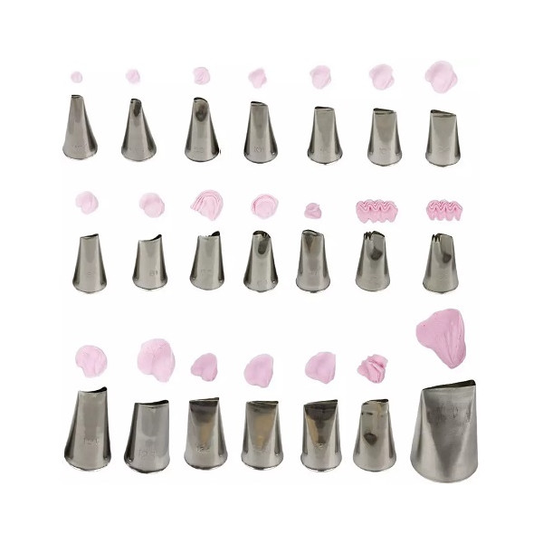 Set da 26 a 52 bocchette per decorazione in acciaio inox Silikomart: scatola completa di beccucci punte o bocchette ed adattatori per sac à poche in acciaio inox