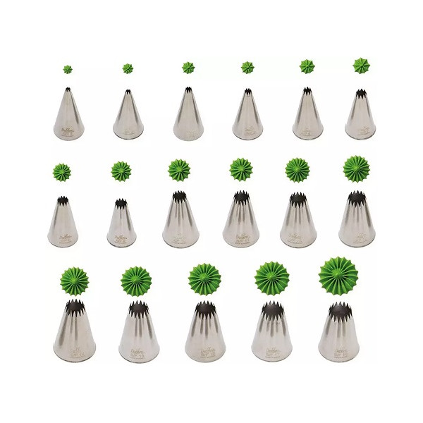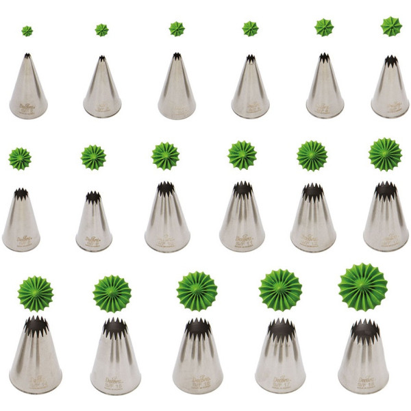 Set 10 cornetti stella in acciaio inox dal diametro 4 a 18 mm Decora: kit di 10 bocchette stella, professionali, senza punti di saldatura, da utilizzare senza adattatore.