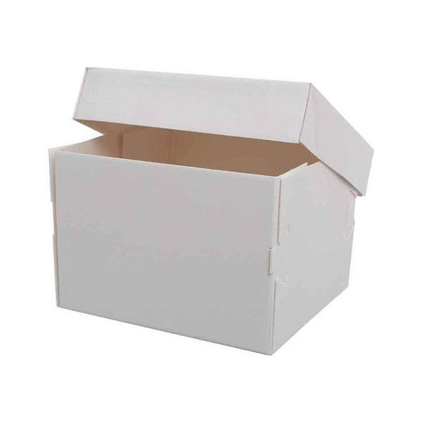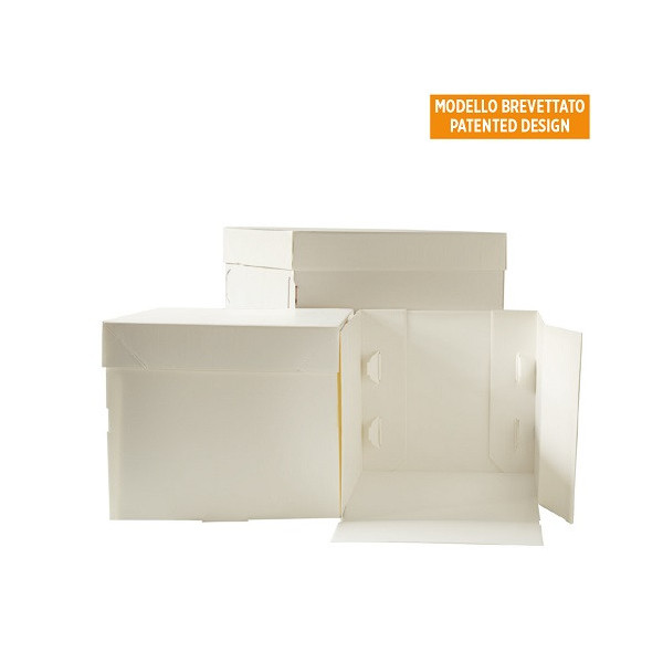 Scatola per torte alte, con coperchio e base quadrata di lato da 26,5 a 50,5 cm in cartoncino bianca per uso alimentare, imbustata singolarmente, ideale per trasportare e conservare dolci o torte.