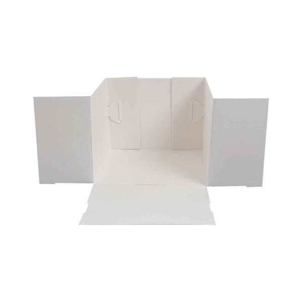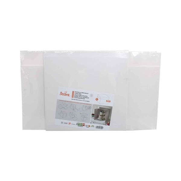 Scatola quadrata per torta e dolci in cartoncino bianco per uso alimentare, di lato da 23 a 36 cm, con manico ed alette, imbustata singolarmente da Decora, ideale per trasportare e conservare dolci e torte decorate.