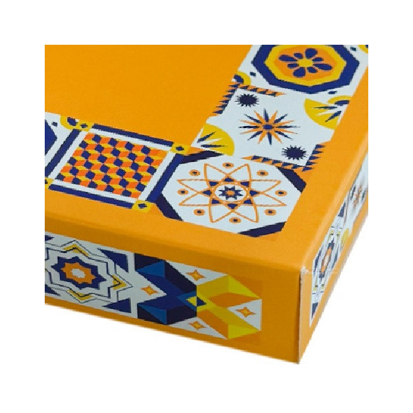 Pratico box auto-montante, in cartone per alimenti, di dimensioni 23x16xh5 cm, l'elegante decoro di piastrelle lo rendono perfetto per confezionare e regalare dolci pensierini fatti in casa.