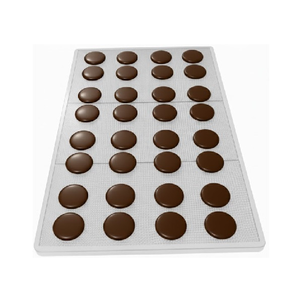 Cioccolatino compressa tonda da 2 g: stampo in policarbonato per 40 cioccolatini tondi dal peso di 2 g, di dimensioni ø20xh5,7 mm, ideale per uso intensivo o professionale.