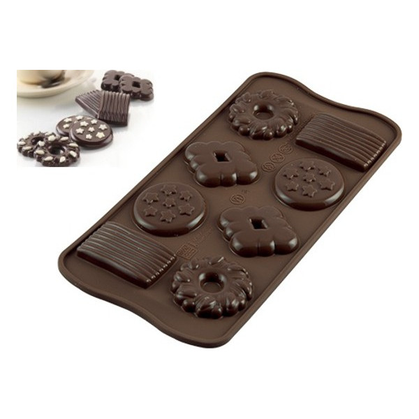 Stampo Choco Biscuit o cioccolatini Biscotto SCG25 da Silikomart: stampo in silicone marrone, con 8 cavità, un mix di forme dei classici biscotti.