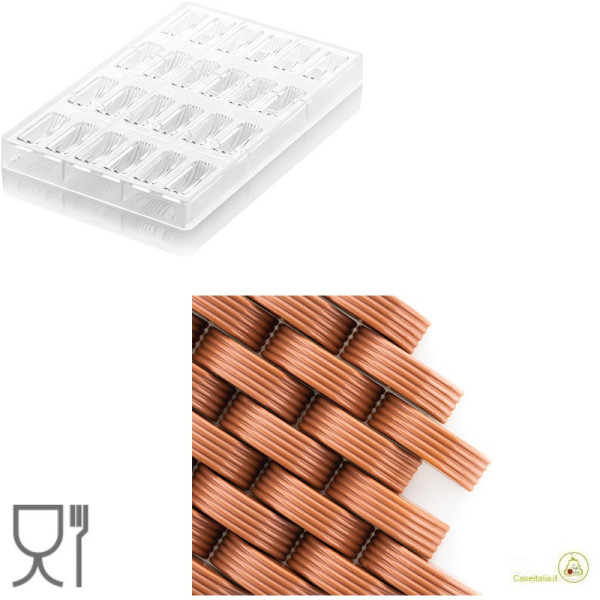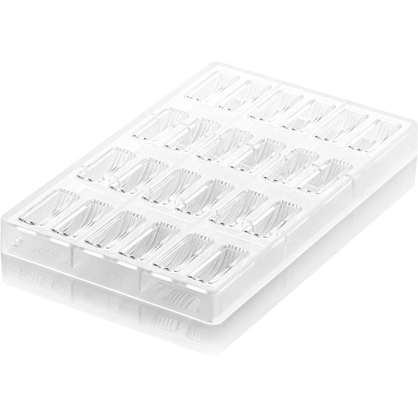 Stampo in policarbonato professionale, a colatura libera, per cioccolatini lenti o lingue di gatto con fondo grecato. Stampo da utilizzare eseguendo una colatura libera del cioccolato, sopra lo stampo mediante macchina tipo One-shot oppure manualmente con una classica sac a poche.