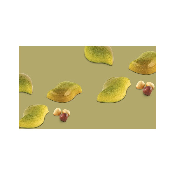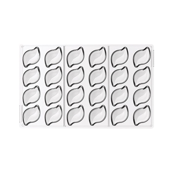 Stampo in Tritan per 24 praline di cioccolato, di dimensioni 44x28 h 15 mm e volume 8 ml, suddivise per la lunghezza in due parti simmetriche un lato liscio e uno il riflesso texturizzato, che permettono di giocare con molti colori e finiture.