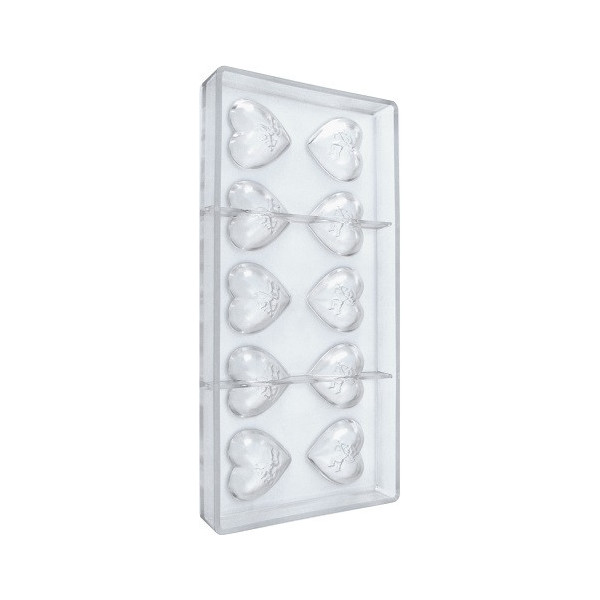 stampo in policarbonato per 10 cioccolatini a forma di piccoli cuore con decoro cupido alato con arco e freccia