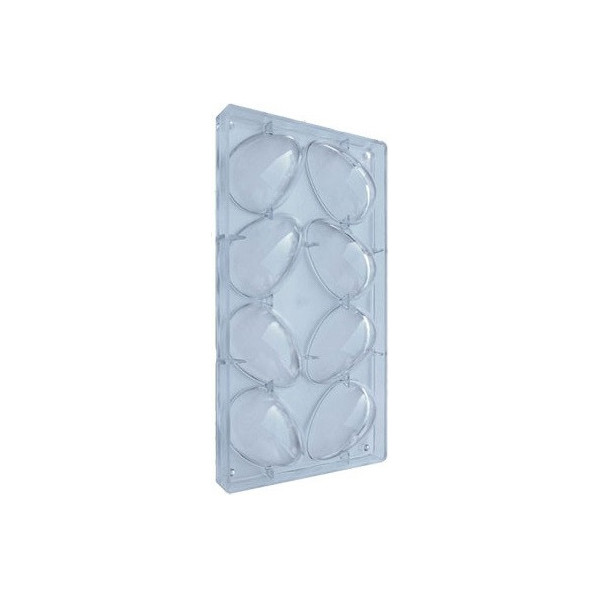 Stampo uova 60 / 70 g, 8 impronte: stampo in policarbonato professionale, per uova di pasqua di cioccolato da 60 / 70 g, con 8 impronte di altezza 100 mm e larghezza 66 mm.