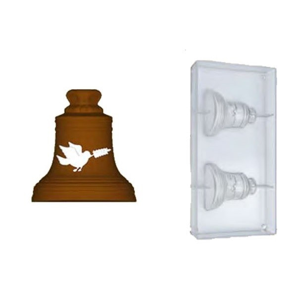 Stampo campana 50 g: stampo, in policarbonato professionale per uso intensivo, forma di campana a cioccolato, di ø7xh8 cm, con decoro uccello con ulivo, ideale monoporzione di cioccolato per pasqua