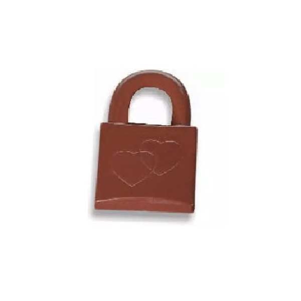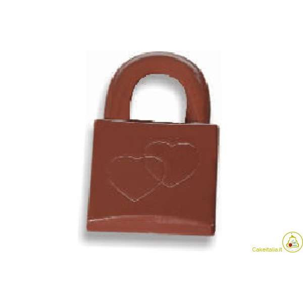 Stampo in policarbonato professionale vi permetterà di realizzare dei cioccolatini a forma di lucchetto con decoro coppia di cuoricini accoppiati nel modo più preciso. Ogni placca, accoppiabile, contiene 12 cavità da mm. 29,5 x 49,5 mm