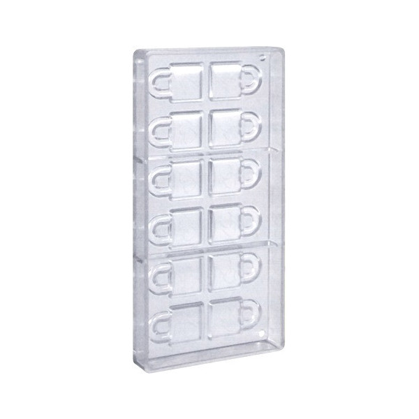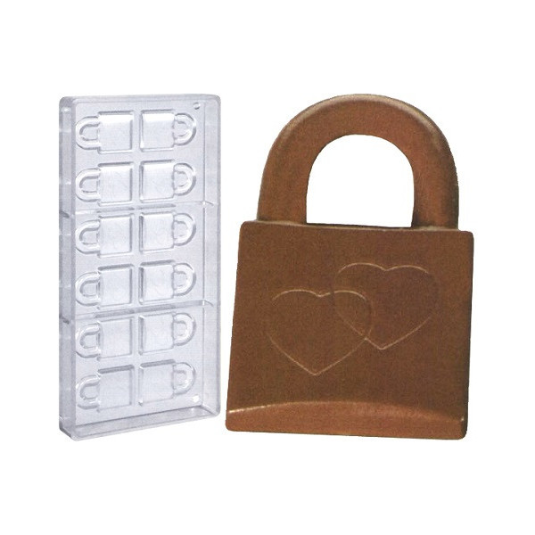 Stampo in policarbonato per 12 cioccolatini a forma di lucchetto con cuoricini accoppiati.