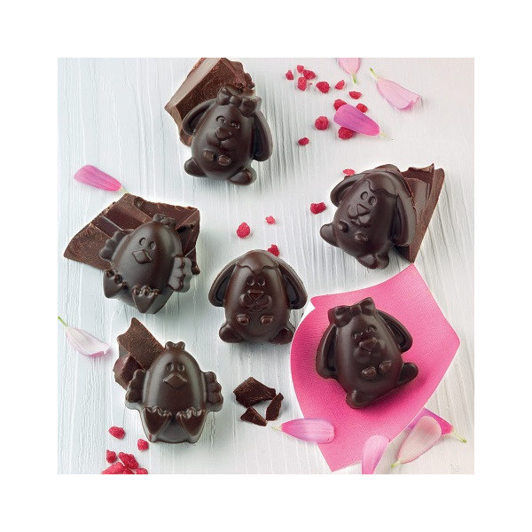 Lo stampo Silikomart Easter friends è uno stampo per cioccolatini in silicone di deliziosi e graziosi cioccolatini a forma Coniglietti e Pulcini. Lo stampo presenta 12 cavità per cioccolatini ispirati alla Pasqua cioè Ovetti di Pasqua a forme di coniglietti e di pulcini. Silikomart SCG030 linea EasyChoc. Adatto a preparare cioccolatini, gelatine, caramelle e ghiaccioli per bevande. Può essere utilizzato anche in forno e in freezer.
