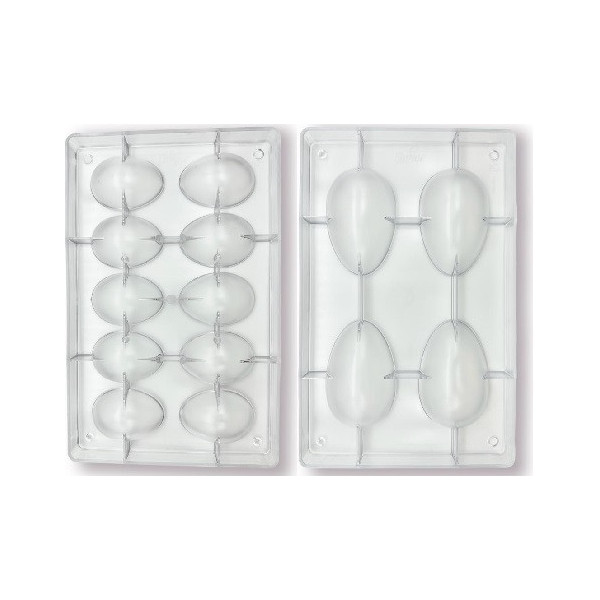 Stampo ovetti di pasqua Decora, in policarbonato professionale per cioccolato. Scegli tra 10 ovetti da 30 g di dimensioni 4,2xh6 cm o 4 ovetti da 70 g di dimensioni 5.6xh8,8 cm