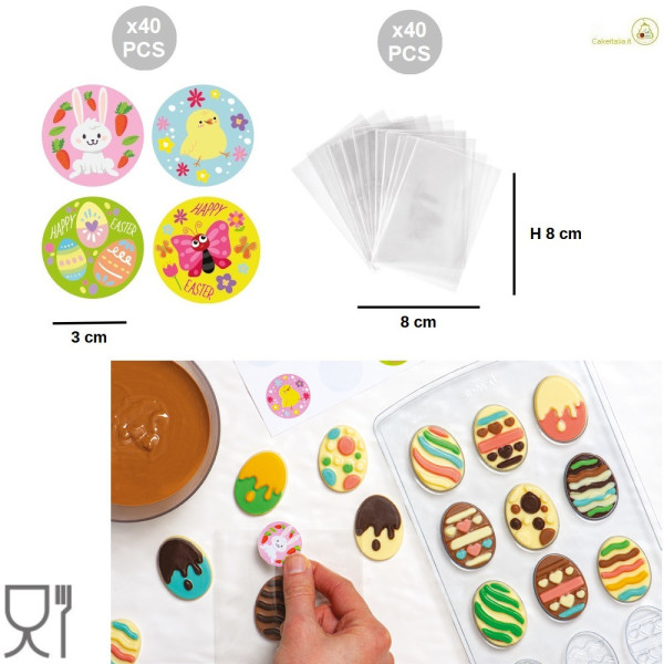 Kit Stampo termoformato per 12 uova decorate: stampo semi rigido in APET, per 12 cioccolatini o praline a forma di uova di pasqua di cioccolato decorate + 40 bustine e 40 adesivi.