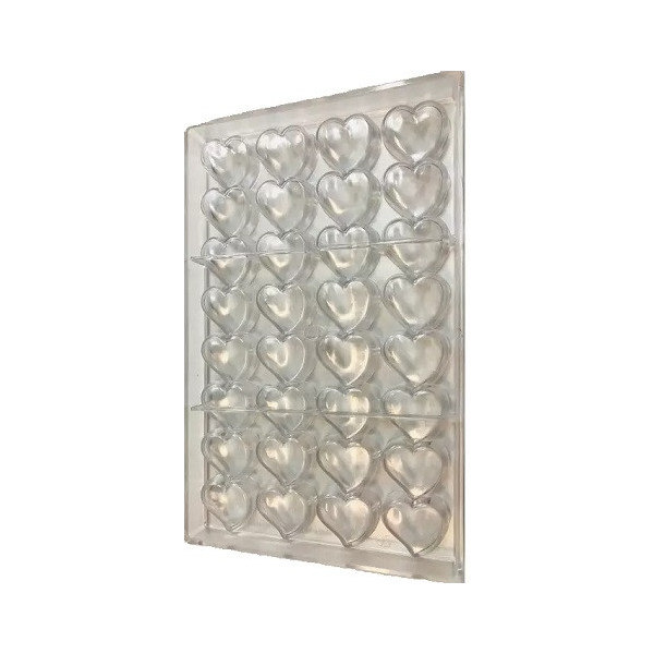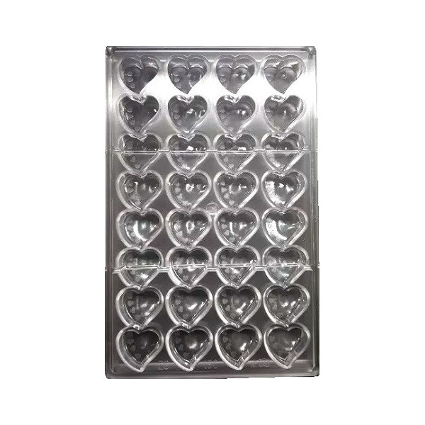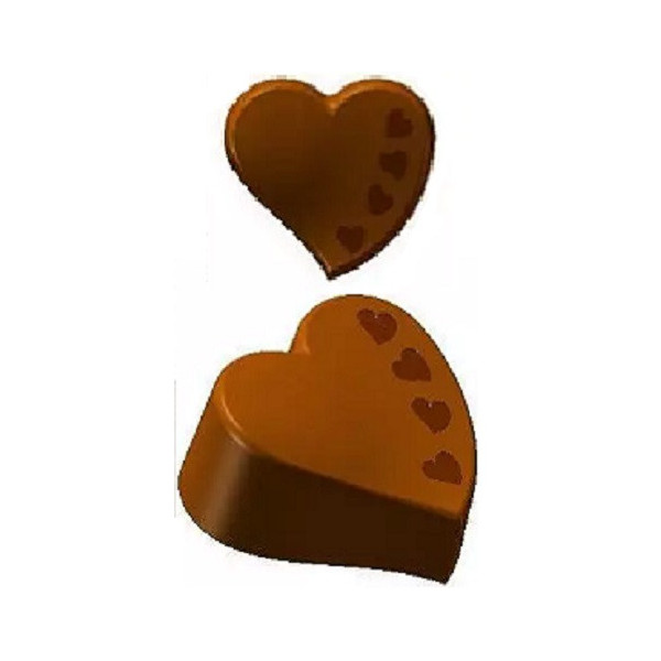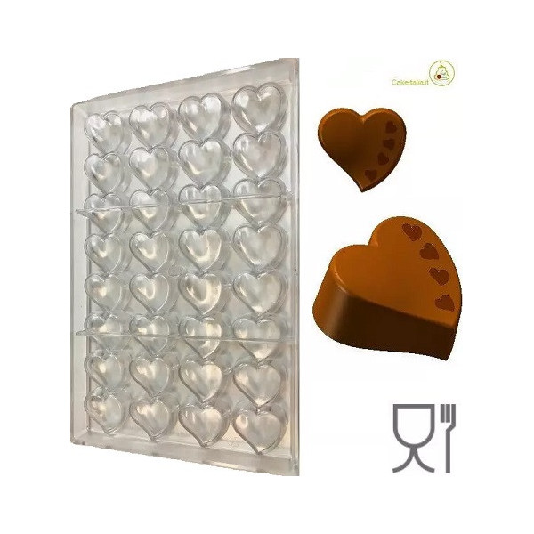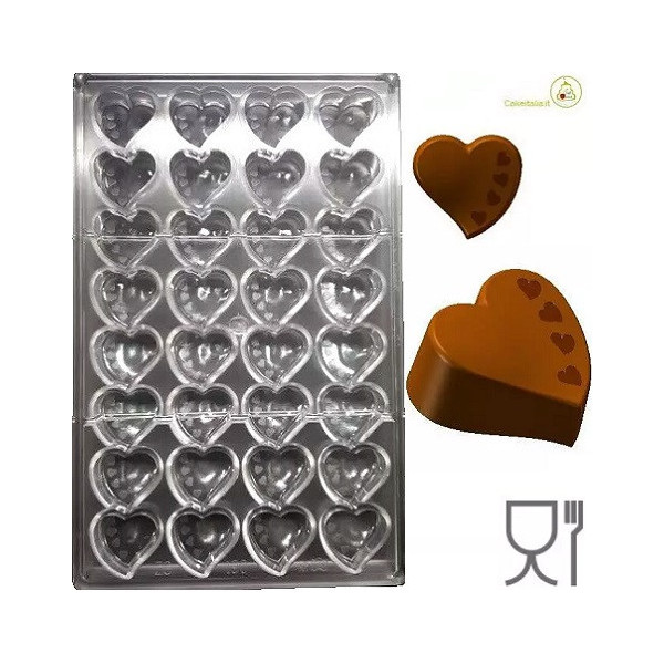 Stampo in policarbonato professionale vi permetterà di realizzare 32 cioccolatini a forma di cuore con decoro cuoricini nel modo più preciso.