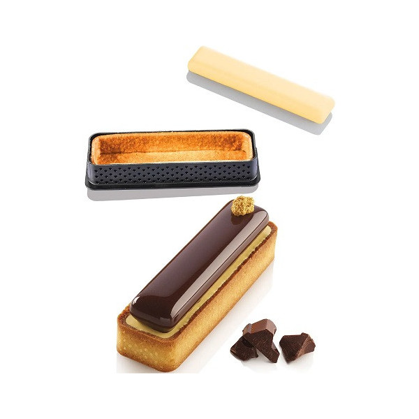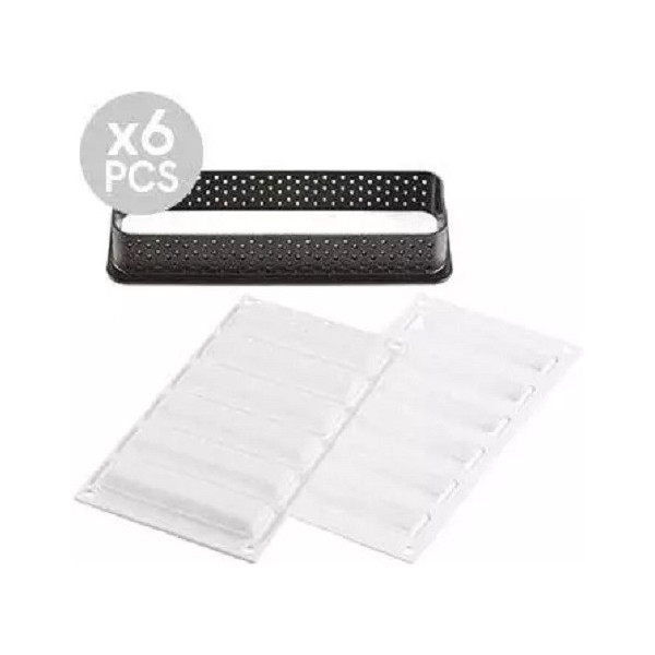 - 1 stampo in silicone con 6 cavità rettangolari da 10,7 cm per realizzare le mousse o i cremosi da adagiare sopra alla pasta frolla.