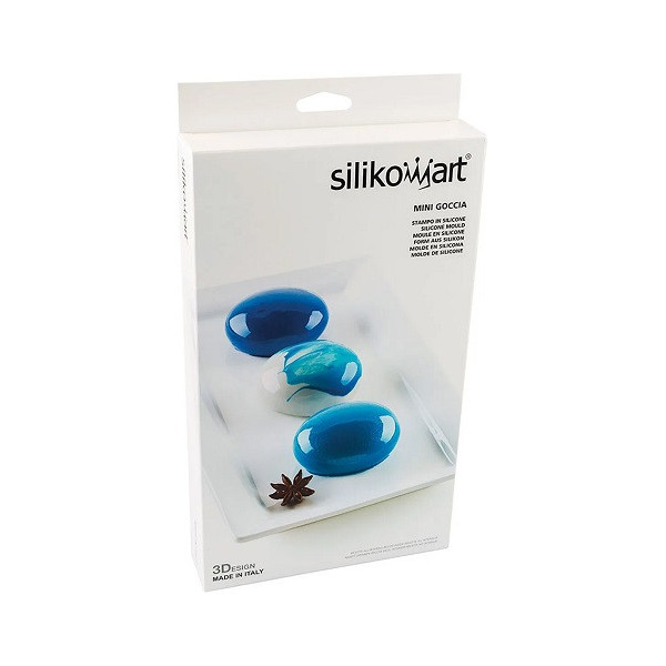 Lo stampo Mini Goccia è uno stampo in Silicone grigio da Silikomart per tortine a forma di goccia liscia, con effetto tridimensionale. La forma dello stampo richiama una goccia liscia dal diametro di 6,8 cm ed altezza 3,3 cm.
