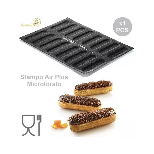 Gli stampi Air Plus 11 Eclair della Linea professionale di stampi AIRPLUS "Microperforated Moulds", grazie alla trama microforata ed al materiale, 100% silicone platinico e alla fibra di vetro sono completamente antiaderenti, permettono una uniforme diffusione del calore ed una perfetta cottura in tempi ridotti.