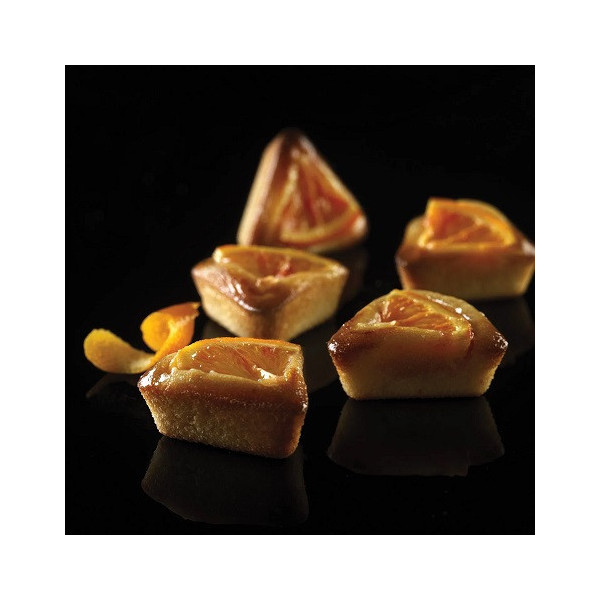 L'innovativo stampo microforato è in silicone e fibra di vetro, con cavità a triangolo per dolcetti triangolari di lato 6 cm ed alti 2,5 cm.