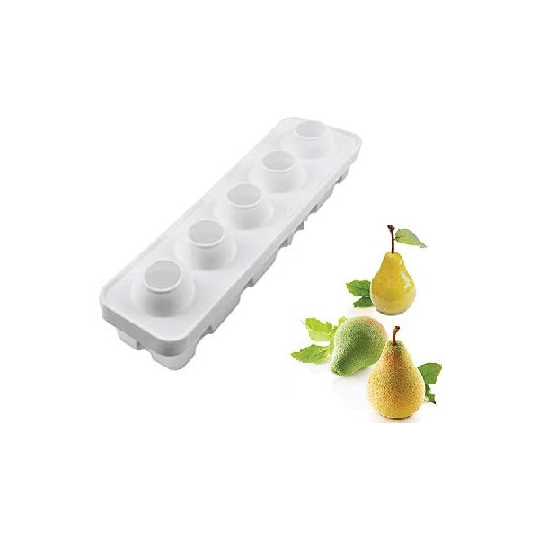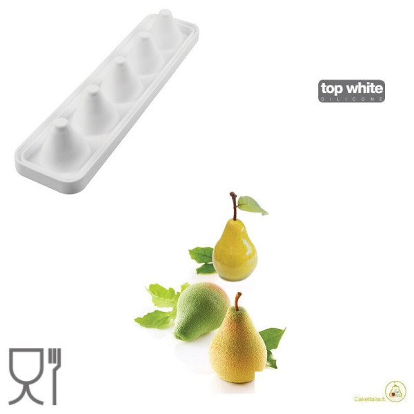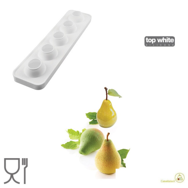 Lo stampo in silicone Pera e Fico da 115 ml, monoporzione grande, è uno stampo in silicone per realizzare frutti perfetti a 3D, di diametro 6 cm, altezza 7,6 cm circa con 5 cavità (linea Top white ad effetto 3D). Lo stampo è corredato da un supporto in plastica per aumentarne la stabilità e facilitarne l’utilizzo. Ideale per semifreddi, torte e dolci a forma di frutta.