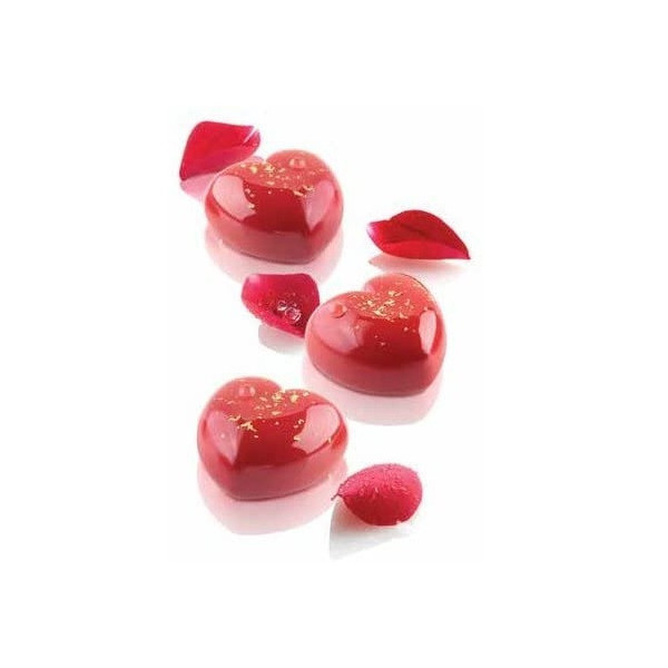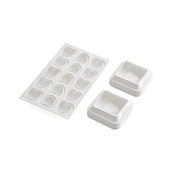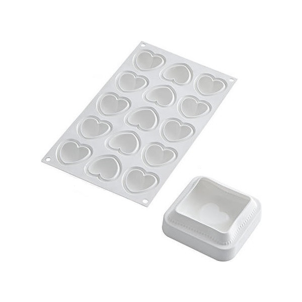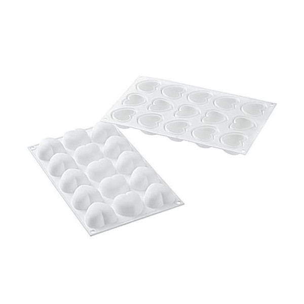 Lo stampo SF200 è uno stampo in silicone per 15 dolcetti a forma di cuoricini mignon, ogni cavità è da 30 ml, lunga 45 mm x 44 mm x h 24 mm, della linea Top White effetto 3D di Silikomart.