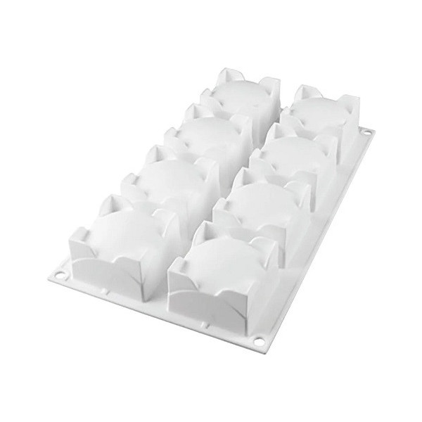 Square Sphere 110 Silikomart, stampo in silicone bianco (linea Top white) per 8 monoporzioni dalla forma innovativa delle semisfere tagliate per ottenere una base quadrata, ideale per semifreddi, tortine e dolci monoporzioni.