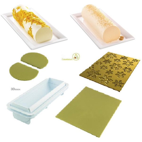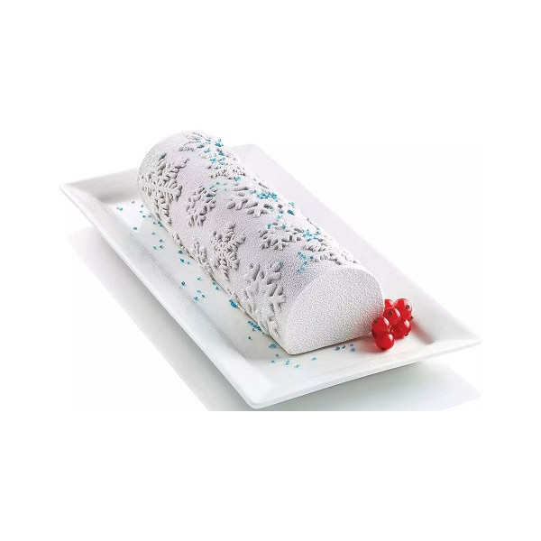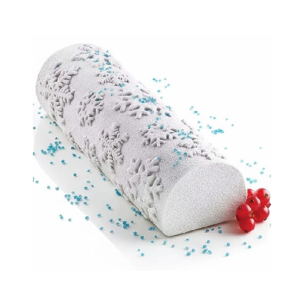 Frozen Bûche Silikomart. kit stampo tronchetto per gelato e semifreddi fiocchi di neve da Silikomart è composto da: supporto per torte a forma di tronchetto + tappeto in silicone decoro fiocchi di neve + tappeto in silicone effetto liscio