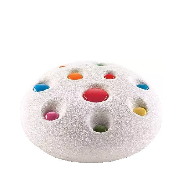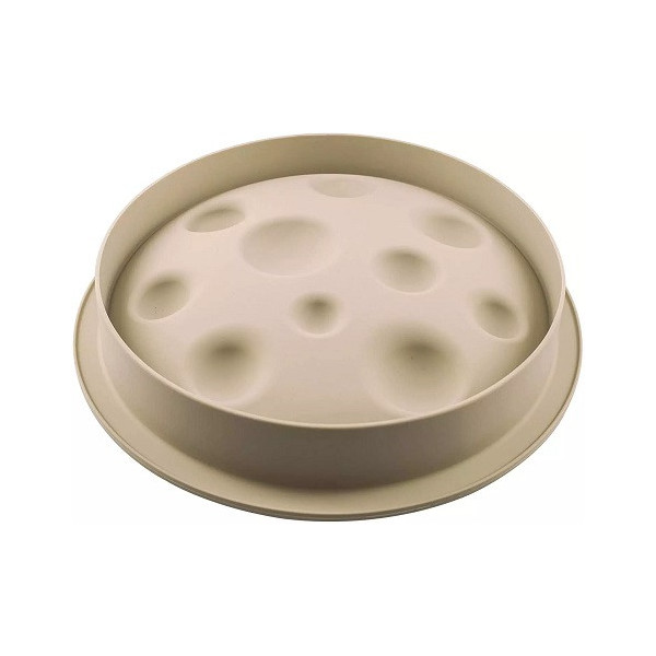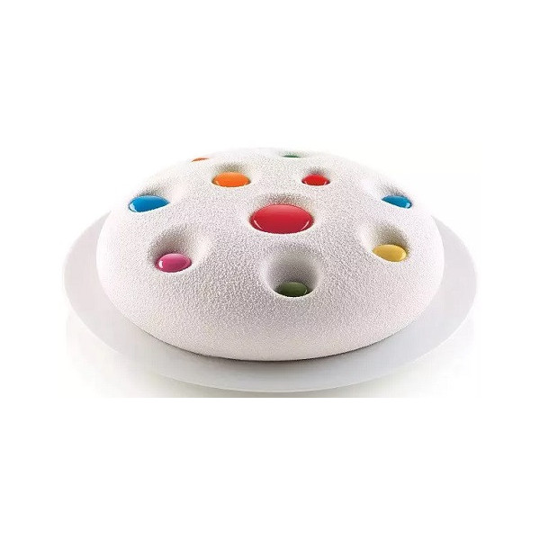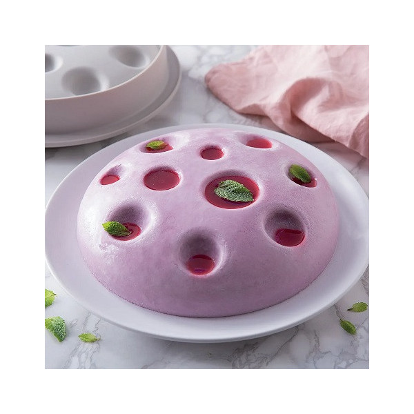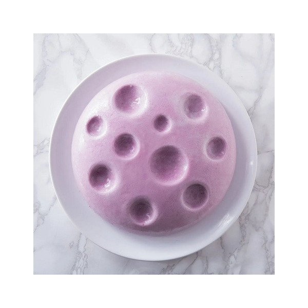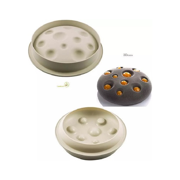 Lo Stampo Luna Silikomart è uno stampo in silicone grigio per torte a forma di semisfera sagomata di crateri, con effetto tridimensionale. La trama della decorazione richiama una superficie lunare liscia sagomata da buchi o crateri, per creare torte dal diametro di 22 cm ed altezza 6 cm.