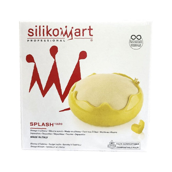 Il set Splash 1320 è composto da 1 stampo in silicone bianco linea Top White per torte a forma di semisfera da 17 cm ed un separatore in plastica per una decorazione con due texture e colori diversi.