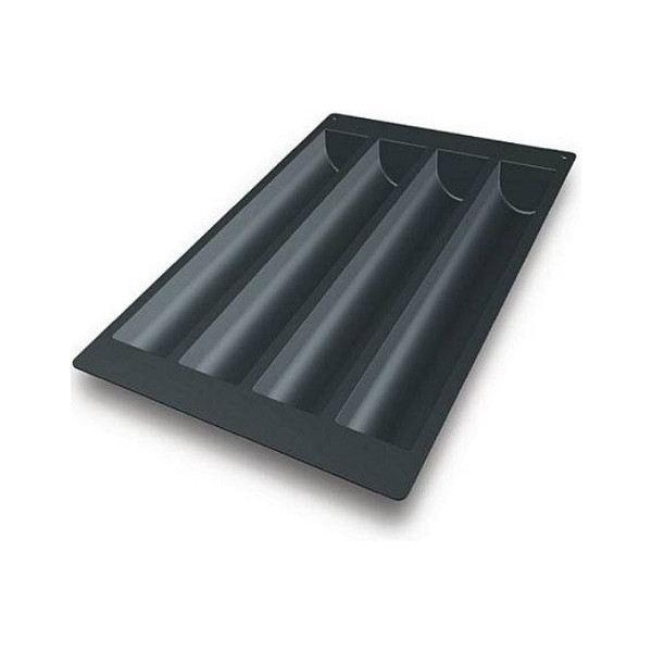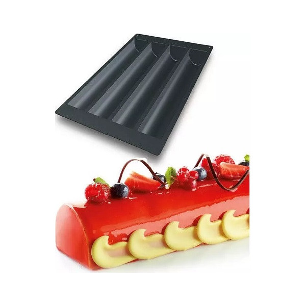 Stampo Tronco SQ014 da Silikomart: teglia 60x40 cm in silicone nero, stampo 4 cavità per torte a tronco lunghe 49,5 cm, larghe 8 cm e alte 6,3 cm,