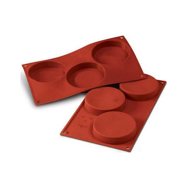 Stampo in silicone color terracotta con 3 cavità ideali per 3 basi tonde di pan di spagna o pasta biscotto di diametro 10,3 cm ed h 2 cm.