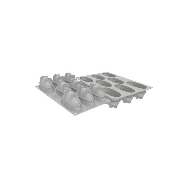 Stampo Sessantaquaranta per 48 quenelle 3D lunghe 63 mm, larghe 31 mm e alte 28 mm, SQ071 in silicone professionale nero da Silikomart.