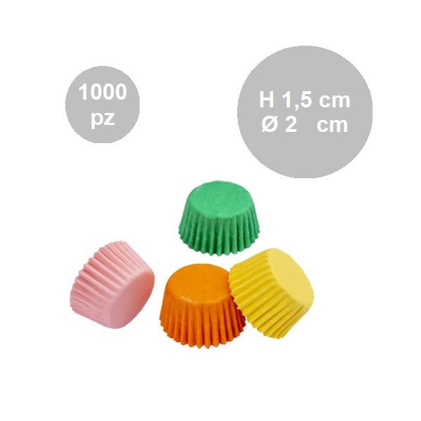 1000 Pirottini mini bonbon colori assortiti in carta forno antiaderente, resistente fino a 220 °C, diametro 2 cm altezza 1,5 cm. Ideali per cuocere e presentare piccoli dolcetti o confetti.