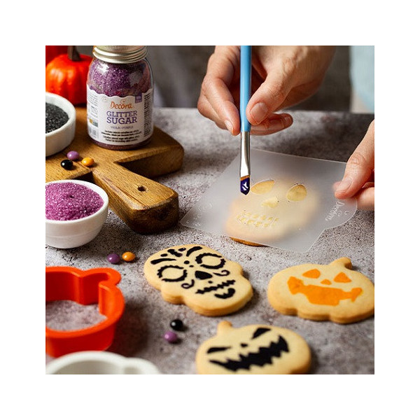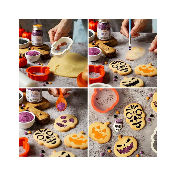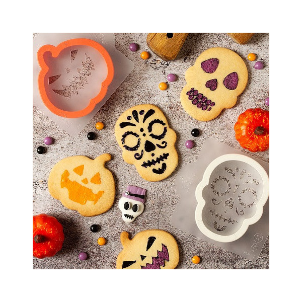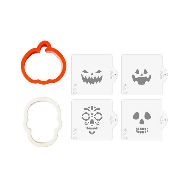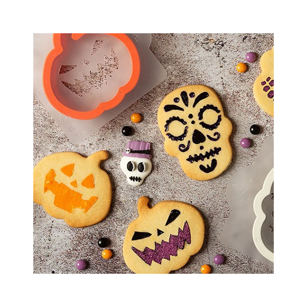 I 4 stencil, due per il teschio e 2 per la zucca, usali per decori 3D che si adattano alle 2 sagome. Disegna facce con sorrisi terrificanti, 3D, colorate con la ghiaccia reale, la crema al burro, lo zucchero a velo, il cacao, le polveri colorate, gli spray coloranti o l’aerografo.