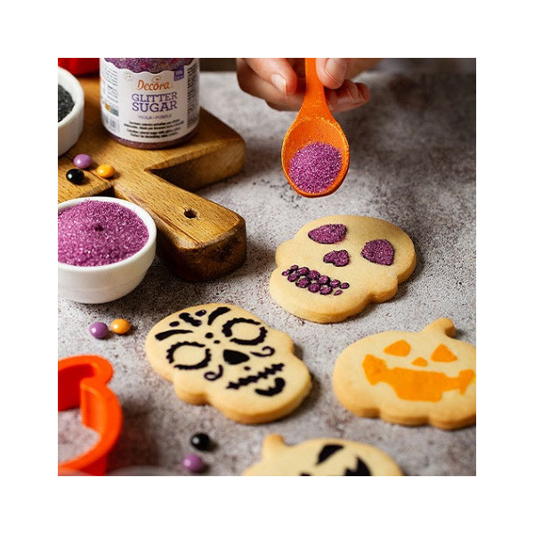 Zucchero glitterato viola Decora da 100 g: cristalli di zucchero extra-fine color viola, effetto glitterato, vivace, lucido e brillante. Zucchero decorativo, pronto all'uso, ideale per decorare torte, dolci biscotti e cupcakes.