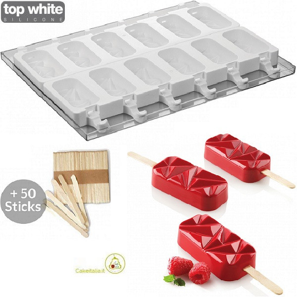 Kit Classic 3D, Gel 14B da Silikomart: set 2 stampi gelati 3D h 9,3 cm in silicone Top White + 50 bastoncini legno di faggio. Usalo anche per preparazioni cotte dolci o salate