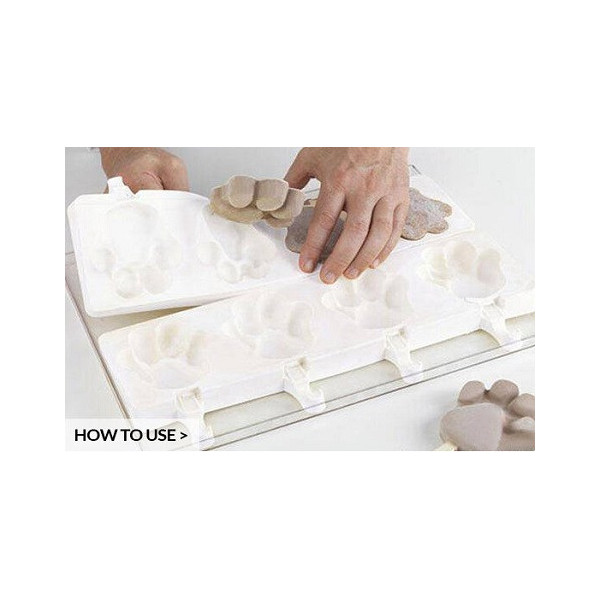 - 2 stampi gelati, a forma di zampa, in silicone Top White, ogni stampo ha 4 cavità a forma di zampa, lunga 89 mm, larga 84 mm ed alta 24 mm,