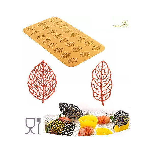 Stampo Foresta, in Silicone giallo Linea Naturae di Silikomart, da 21 impronte di 2 tipi di foglie di foresta ideali per decorare preparazioni sia dolci che salate in versione cotte o semifreddi.