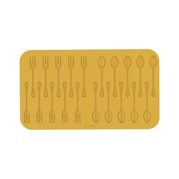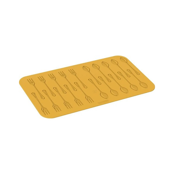 Coperto Silikomart, stampo in silicone giallo Linea Naturae per 20 impronte 10 a forma di cucchiaio e 10 di forchette.