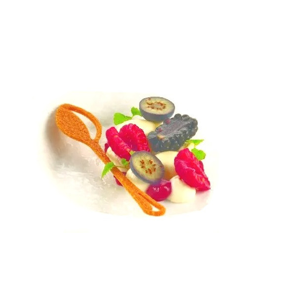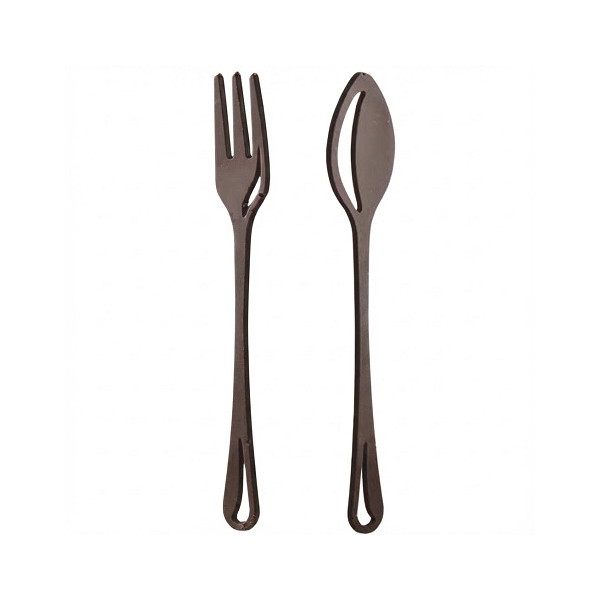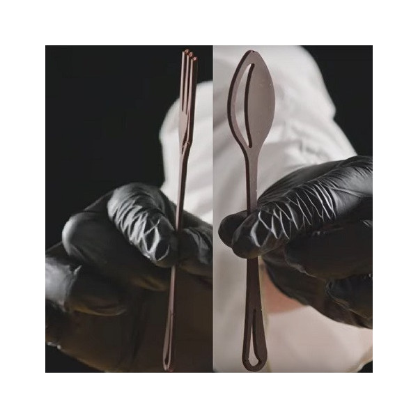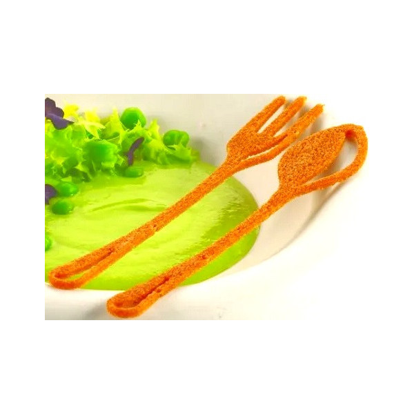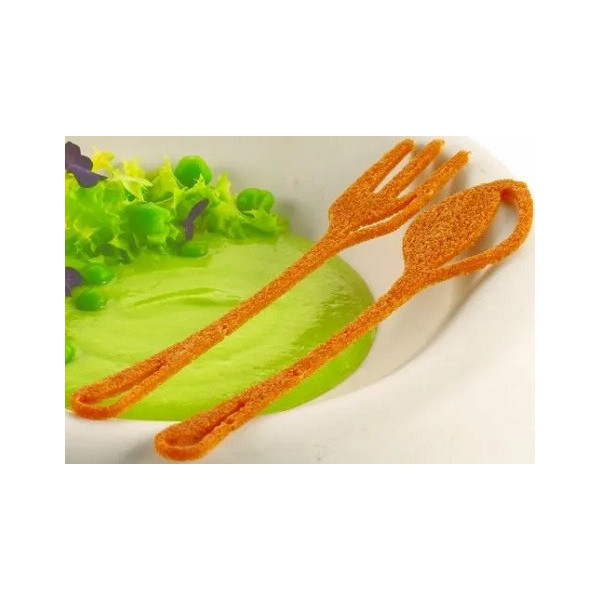 Coperto Silikomart, stampo in silicone giallo Linea Naturae per 20 impronte 10 a forma di cucchiaio e 10 di forchette da utilizzare sia con la tuile sia con il cioccolato per creare decorazioni eleganti e raffinate.