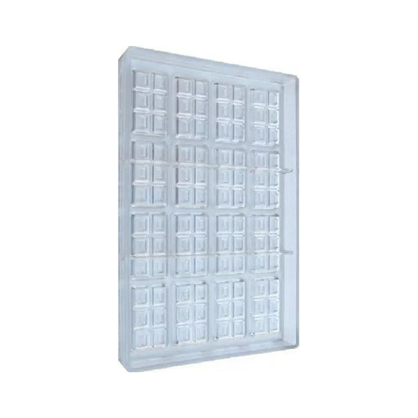 Stampo in policarbonato per mini tavoletta di cioccolato rettangolare 16 mini blocchi da 10 g di dimensioni 55x30xh6,3 mm. Ideale per preparare 16 mini tavolette di cioccolato o 16 snack da 10 g.