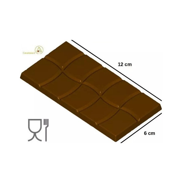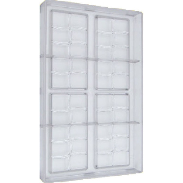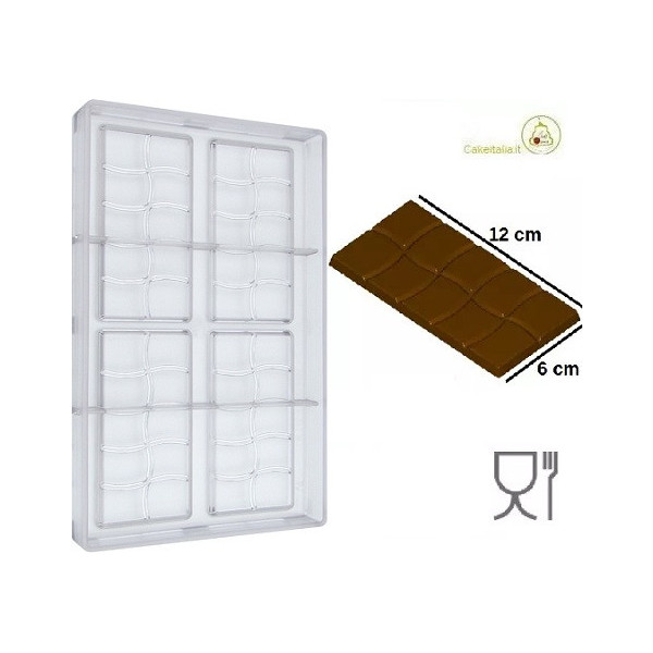Stampo cioccolato Tavoletta rettangolare onda dal peso di 50 g, composta da 4 cavità lunghe 120 mm, larghe 60 mm ed alte 6,3 mm. Ogni tavoletta è suddivisa in 10 quadretti.
