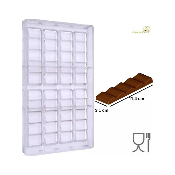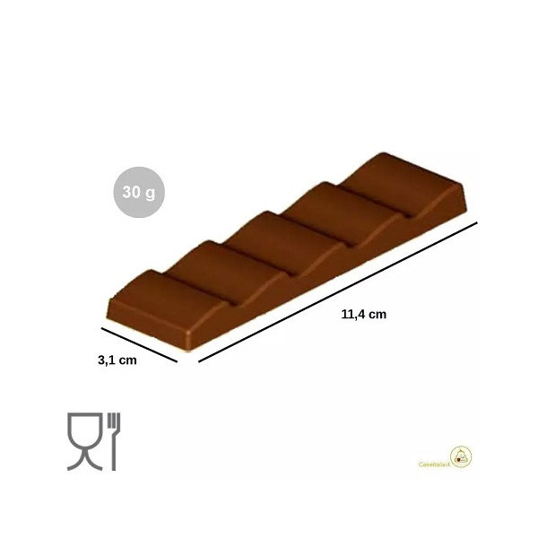 Stampo in policarbonato per barretta di cioccolato dal peso di 30 g, composta da 8 cavità lunghe 114 mm, larghe 31 mm ed alte 9 mm. Ogni barretta è suddivisa in 5 scalini.
