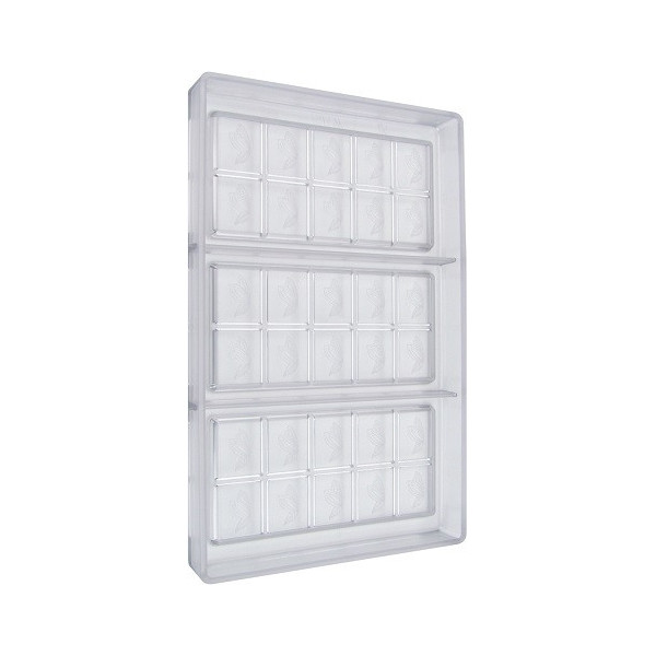Stampo in policarbonato per 3 tavolette da 145,5x67,5xh7 mm, ogni tavoletta è suddivisa in 10 quadretti.
