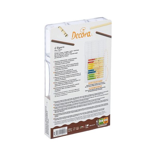 Stampo cioccolatino sigaro, 18 brevettate lunghe 8,5 cm, larghe 0,5 cm in policarbonato professionale, forma brevettata da Decora.