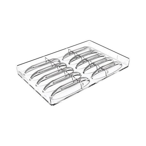 Stampo in Tritan per 10 barrette di cioccolato, di dimensioni 115x25 h 15 mm e volume 28 ml, dalla forma affusolata, oblunga.