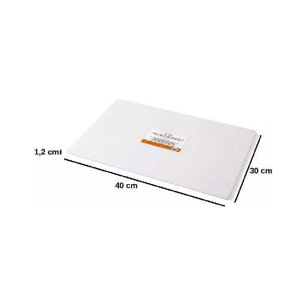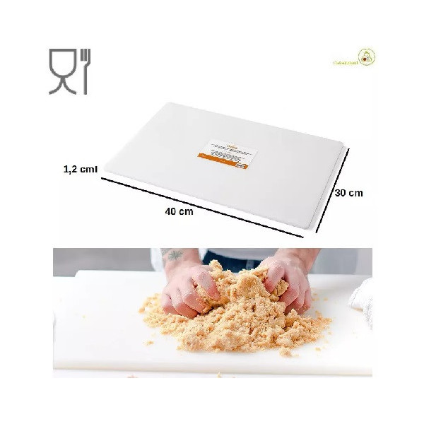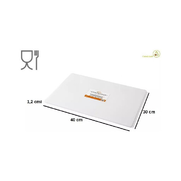 Piano da lavoro in plastica antiaderente di dimensioni 30x40 cm ed altezza 1,2 cm, dalla superfice lucida e levigata, ideale per lavorare e stendere qualsiasi impasto.