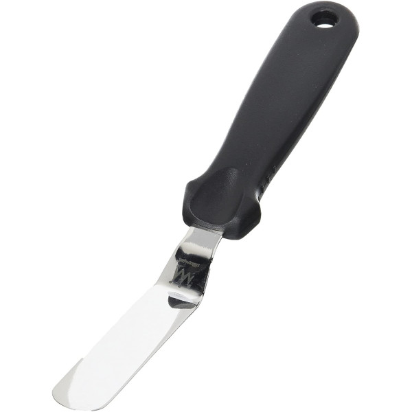 Usa la spatola angolare, con lama piatta e liscia, in acciaio flessibile con impugnatura in plastica nera per spostare dolci e spalmare creme, cioccolato e ghiaccia sulle torte.